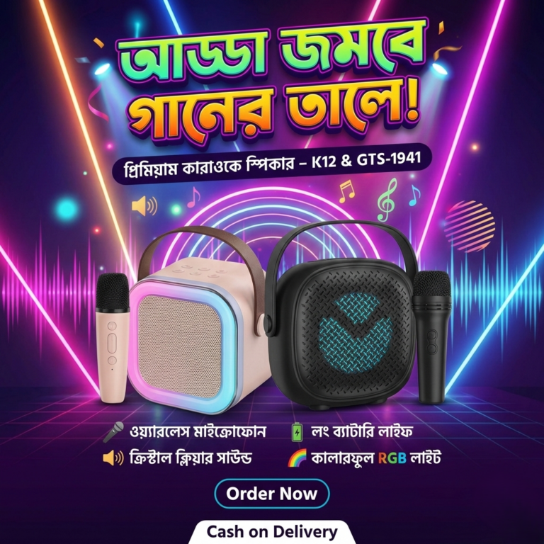 "আপনার ঘরকে বানান কনসার্ট হল! পোর্টেবল ব্লুটুথ স্পিকার ও ওয়্যারলেস মাইক্রোফোন সেট।"